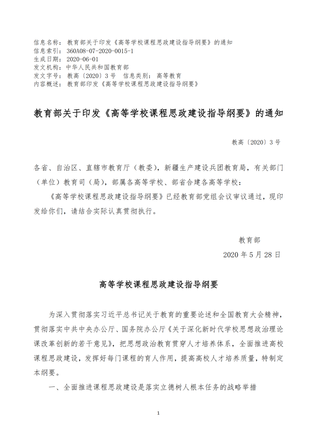 教育部关于印发《高等学校课程思政建设指导纲要》的通知(教高【2020】3号)